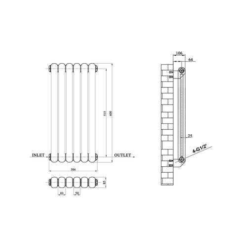 Modern Splash Anthracite Horizontal Cast Iron Round Tube Radiator 600x804mm Double